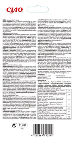 Analytische bestanddelen: Ruw eiwit (min) 7%, ruw vet (min) 0,8%, ruwe vezels (max) 0,3%, vocht (max) 88%, DHA (min) 0,04$, EPA (min) 0,04%, Calcium (min) 0,3%, Vitamine E (min) 310IU/kg, taurine (min) 0,025%