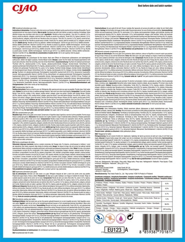 Chicken With Scallop Recipe (5x): Water, kip, tapiocazetmeel, Sint-jakobsschelp, natuurlijke smaakstoffen, natuurlijke Sint-jakobsschelparoma, guargom, vitamine E-supplement, taurine, groene thee-extract