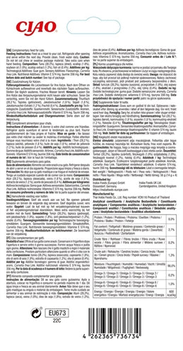 Analytische bestanddelen: Ruw eiwit (min) 7%, ruw vet (min) 2,8%, ruwe vezels (max) 0,3%, vocht (max) 88%, Vitamine E (min) 310IU/kg, taurine (min) 0,025%, Omega-3 (min) 0,2%, Omega-6 (min) 1%