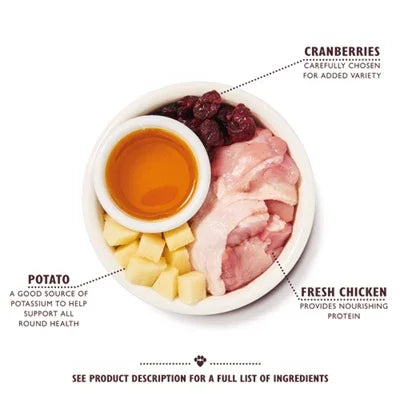 70% kip: verse kip 65%, kippenlever 5%. Aardappel 22%, ei, kipjus, lijnzaad, prebiotica fructooligosacchariden 0,7 g/kg, cellulose, Italiaanse kaas, zeewier, wortelen 0,02%, veenbessen, bosbessen, peterselie 0,02%, fenegriekzaden