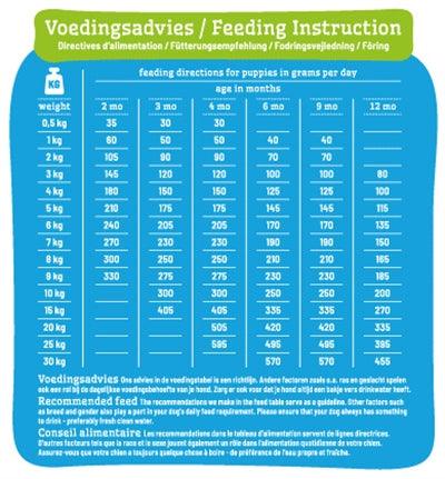 Introduceer deze voeding geleidelijk over een periode van 7 dagen om spijsverteringsproblemen te voorkomen. Zorg dat jouw pup altijd toegang heeft tot vers drinkwater. Bewaar het voer op een koele, droge plaats.