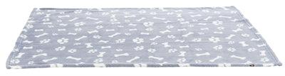Dit hondendeken heeft een blauwe kleur met een witte print van botjes en pootafdrukken. Het is perfect te gebruiken in een hondenmand, op de bank of als bescherming in de auto.