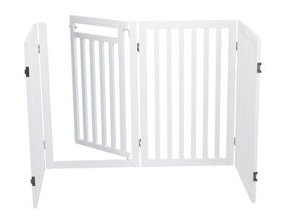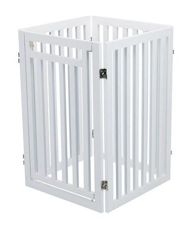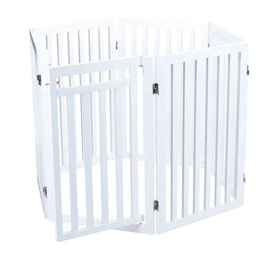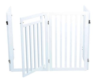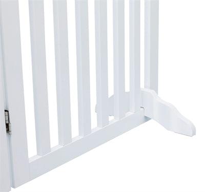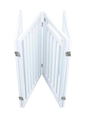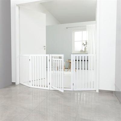Het Trixie Hondenhek Met Deur Wit 60-160 x 81 cm is een vierdelig hek uit gelakt MDF, op verschillende manieren op te stellen, met voetjes.