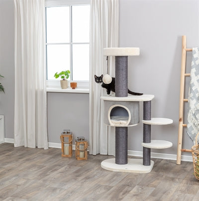 De Trixie Krabpaal Marcello Grijs 60X48X140 cm is luxe krabpaal met vijf verdiepingen en een schuilplaats. Deze krabpaal biedt jouw kat een wereld van plezier en comfort. Met vijf verdiepingen bedekt met pluche en palen omwikkeld met sisal, biedt deze krabpaal voldoende ruimte voor klimmen, krabben en ontspannen. Jouw kat kan zich heerlijk terugtrekken in de schuilplaats met een wendbaar kussen of zich nestelen in de relax-mand. De kussens zijn op de hand te wassen. Voor extra speelplezier is er een speelballetje aan een touw bevestigd. Deze krabpaal is de ideale combinatie van speelruimte en ontspanning voor jouw kat.