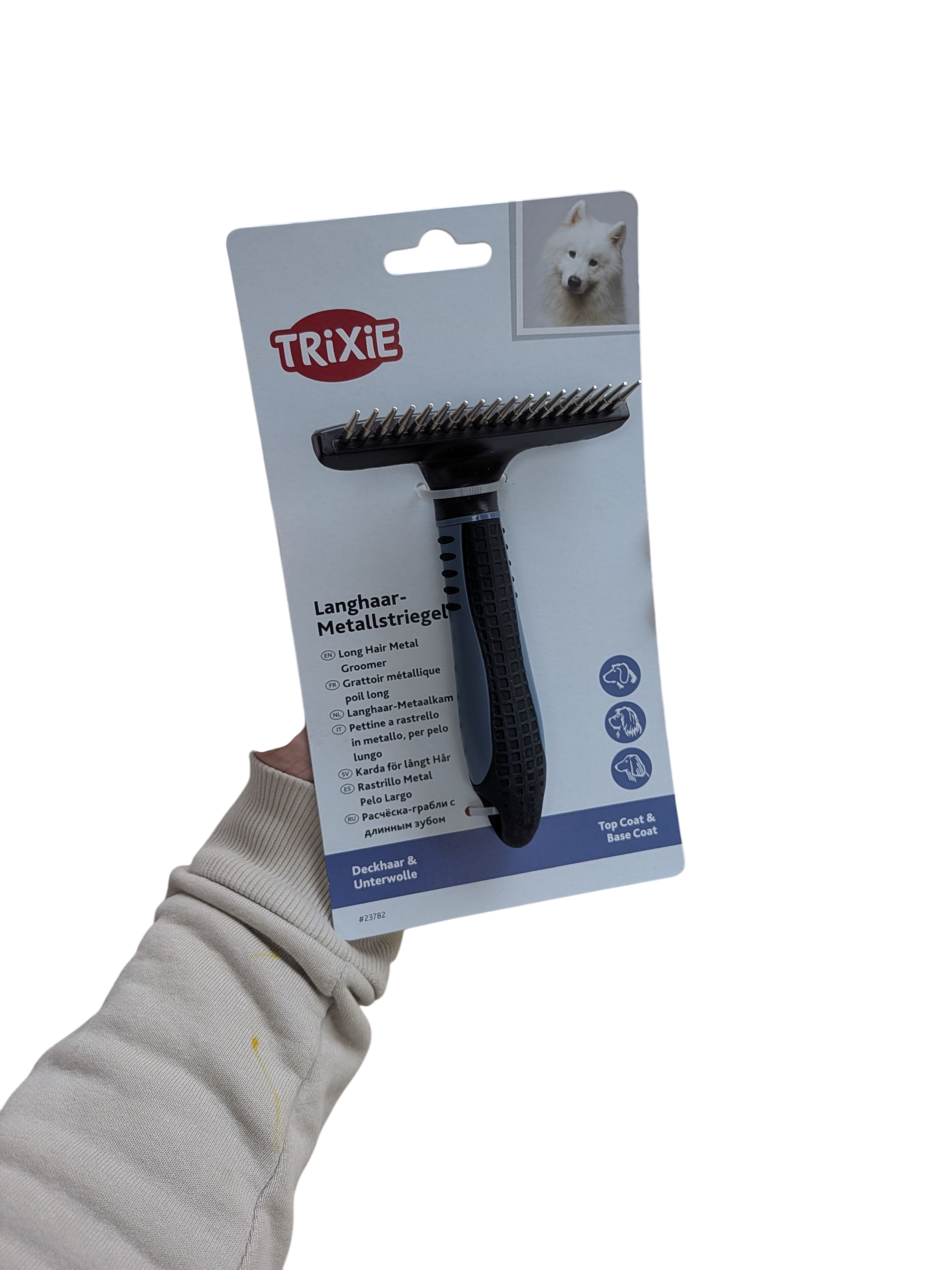 Tämä metallinen kampa sopii pitkäkarvaisten koirien aluskarvan tehohoitoon.