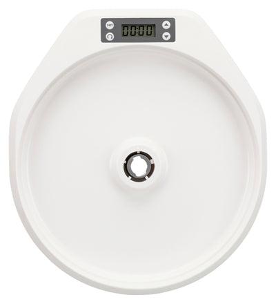 De Trixie TX4+1 Automatische Voerdispenser Wit / Grijs van 36 x 33 x 5 cm is een voerautomaat voor hond en kat, voor 4 + 1 maaltijden à 0,24 liter die ook geschikt is voor natvoer. Deze moderne, ronde voerautomaat is voorzien van een draaimechanisme, waardoor er telkens een ander van de vijf vakken 'open' komt te liggen. De opening van de voerautomaat draait over de diverse vakken heen, per ingestelde interval voor vier maaltijden. Per vakje kun je 0,24 liter voer toevoegen, en omdat de schaal van kunststof is, mag dit zowel natvoer als droogvoer zijn. De voerschaal is vaatwasserbestendig voor gemakkelijke reiniging. De TX4+1 werkt op batterijen (4 AA mignon batterijen, niet meegeleverd), dus hoef je niet bang te zijn dat de automaat bij bijvoorbeeld stroomuitval niet meer werkt.