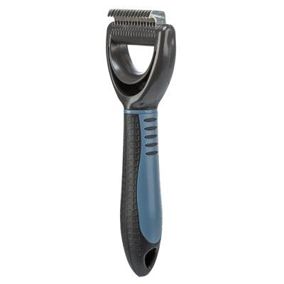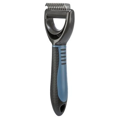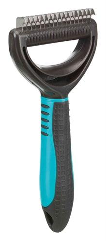 De kam is voorzien van een vertanding met een lengte van 1 cm, ideaal voor het gladmaken van zowel het dekhaar als de vervilte onderwol. De combinatie van het kunststof handvat met een rubberen coating en het metalen kamgedeelte zorgt voor een stevige grip en een lange levensduur.