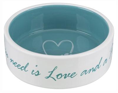 Vul deze voerbak met eten en jouw lieveling zal hem gretig leegeten. Op de voerbak staat in petrol kleurige letters de tekst "All you need is Love and a pet".