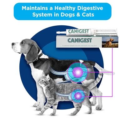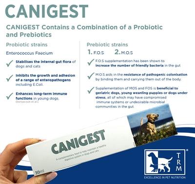 TRM Canigest 30 ml is een smakelijke pasta voor honden en katten ter ondersteuning van het spijsverteringsstelsel. De kracht van Canigest ligt in zijn quadrupel action-formule, een krachtige mix van vriendelijke bacteriën die de darmflora herstellen. Het bevat een combinatie van probiotica, prebiotica, glutamine, kaolien en pectine, speciaal ontworpen ter ondersteuning van de behandeling van spijsverteringsproblemen bij huisdieren. Canigest in pastavorm is eenvoudig te doseren en kan helpen bij:
